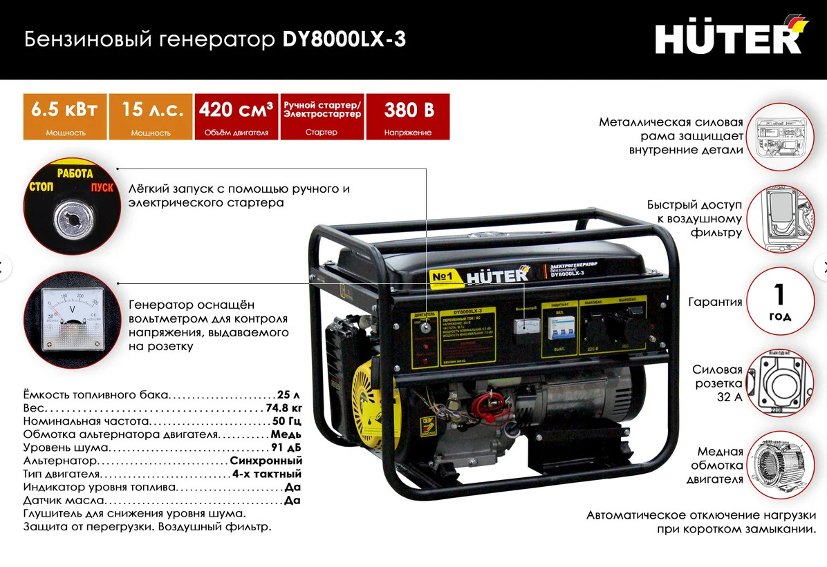 Мощный, надежный, качественный генератор HUTER DY8000LX-3 станет незаменимым резервным источником электроэнергии на любом объекте, где используется сварочное и строительное оборудование, обеспечит питанием бытовую технику на даче, в гараже.