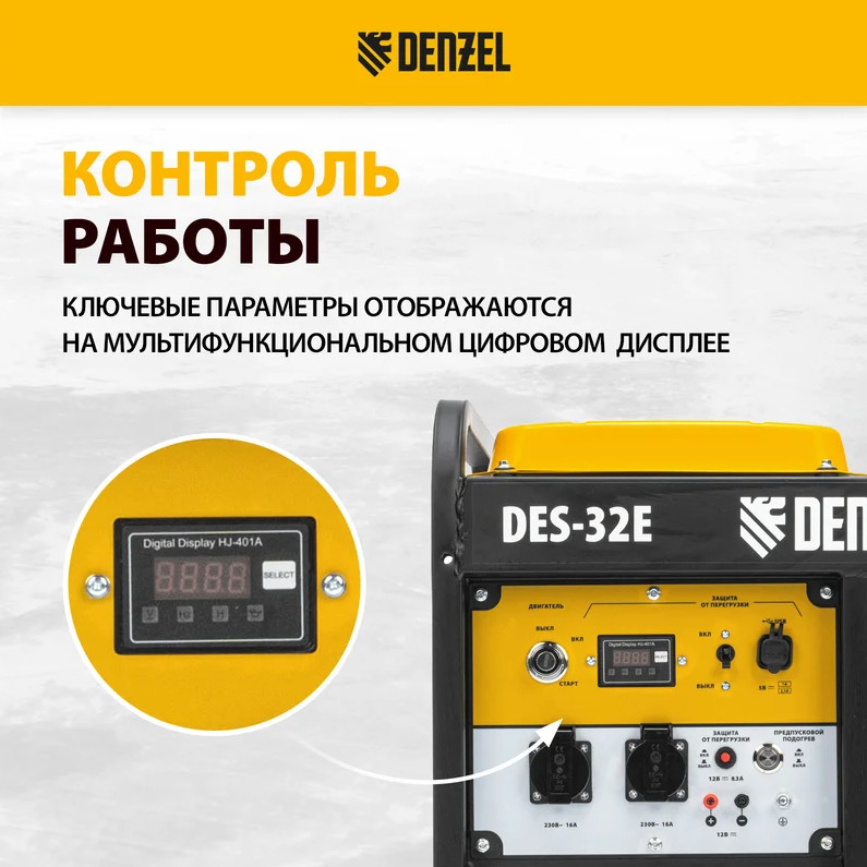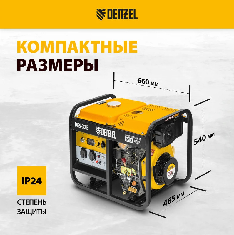 - Мобильность — к генератору можно приобрести транспортировочный комплект Denzel 94905 для перемещения по рабочей площадке