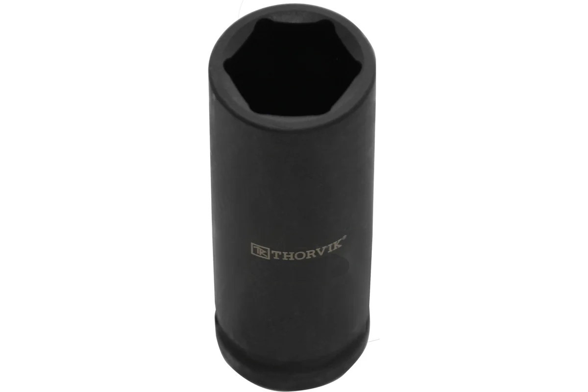 Головка торцевая ударная глубокая Thorvik изготовлена с применением технологий, позволяющих передавать усилия, превышающие расчетные по современным стандартам на 30%. Широкий диапазон размеров, типов и профилей, высокая точность обработки, качественная хромомолибденовая сталь (Cr-Mo) и устойчивое фосфатированное покрытие делают инструмент надежным и долговечным. Торцевые головки Thorvik являются основной для создания систем сборного слесарно-монтажного инструмента. Имеет отверстие для фиксирующего штифта и выточку для уплотнительного кольца.