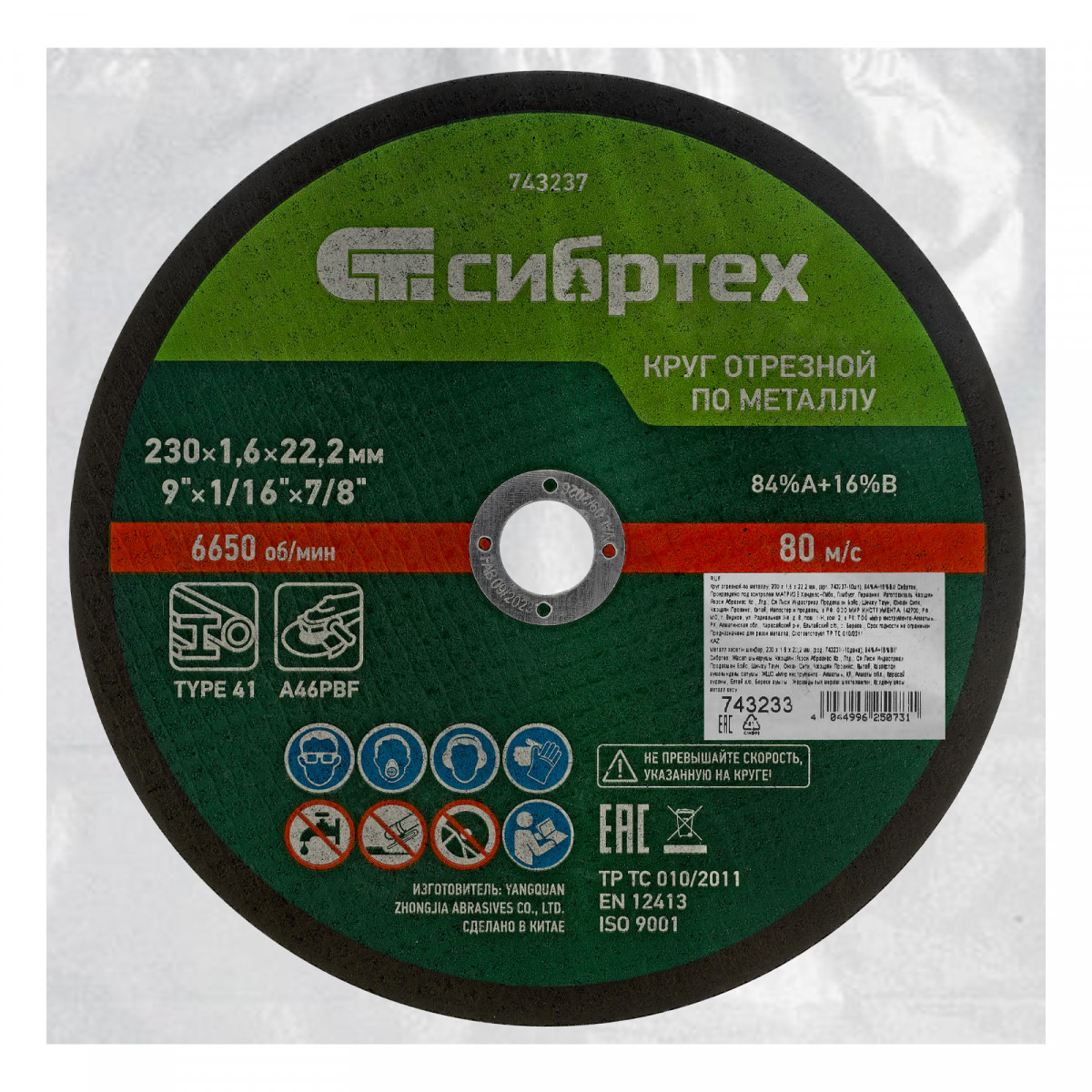 Круг отрезной по металлу, 230 х 1,6 х 22,2 мм, 84%A+16%B, в пленке, 10 шт Сибртех