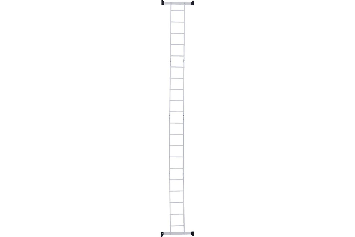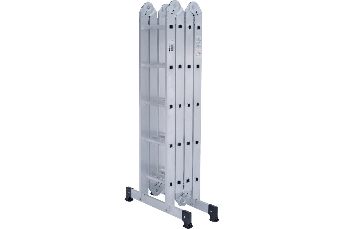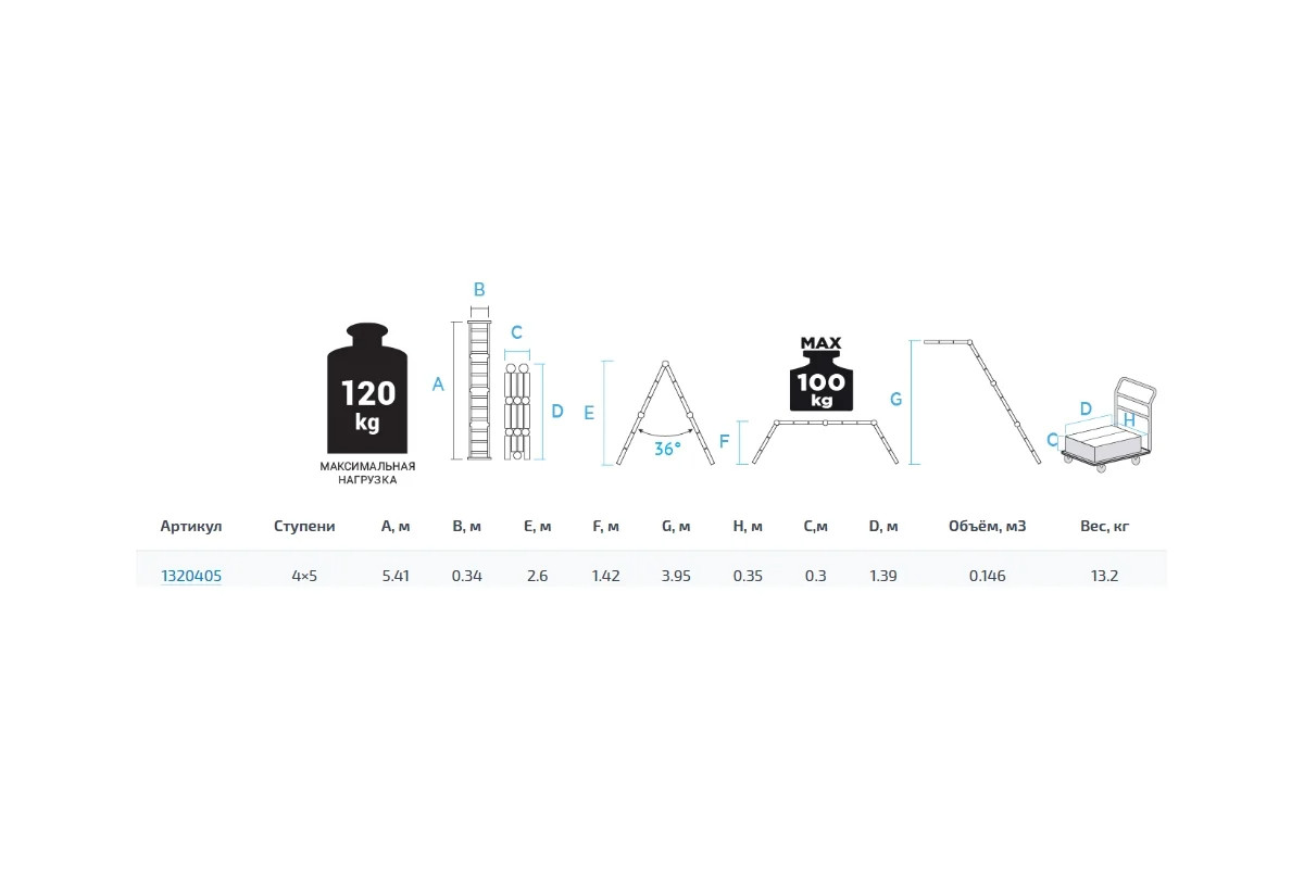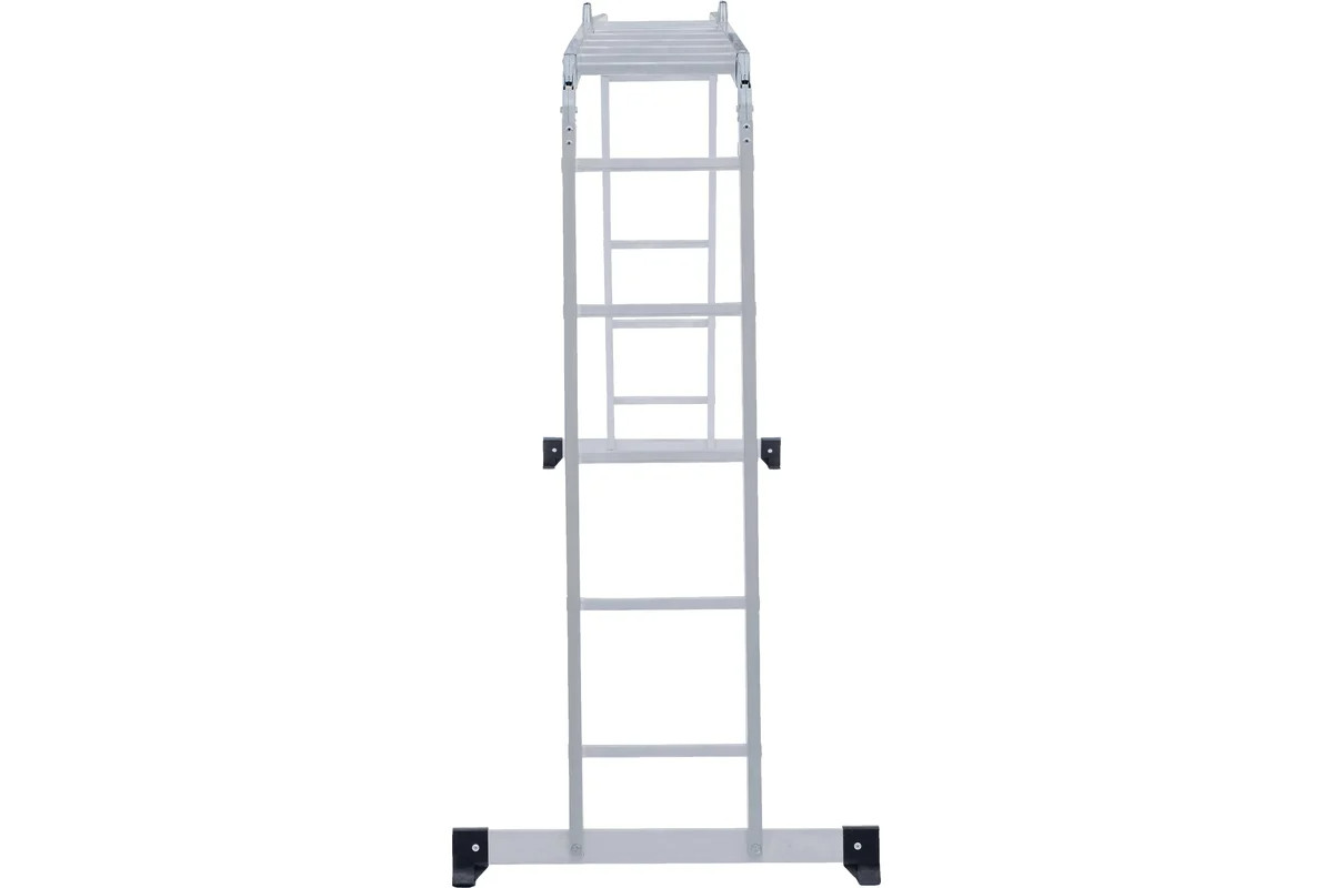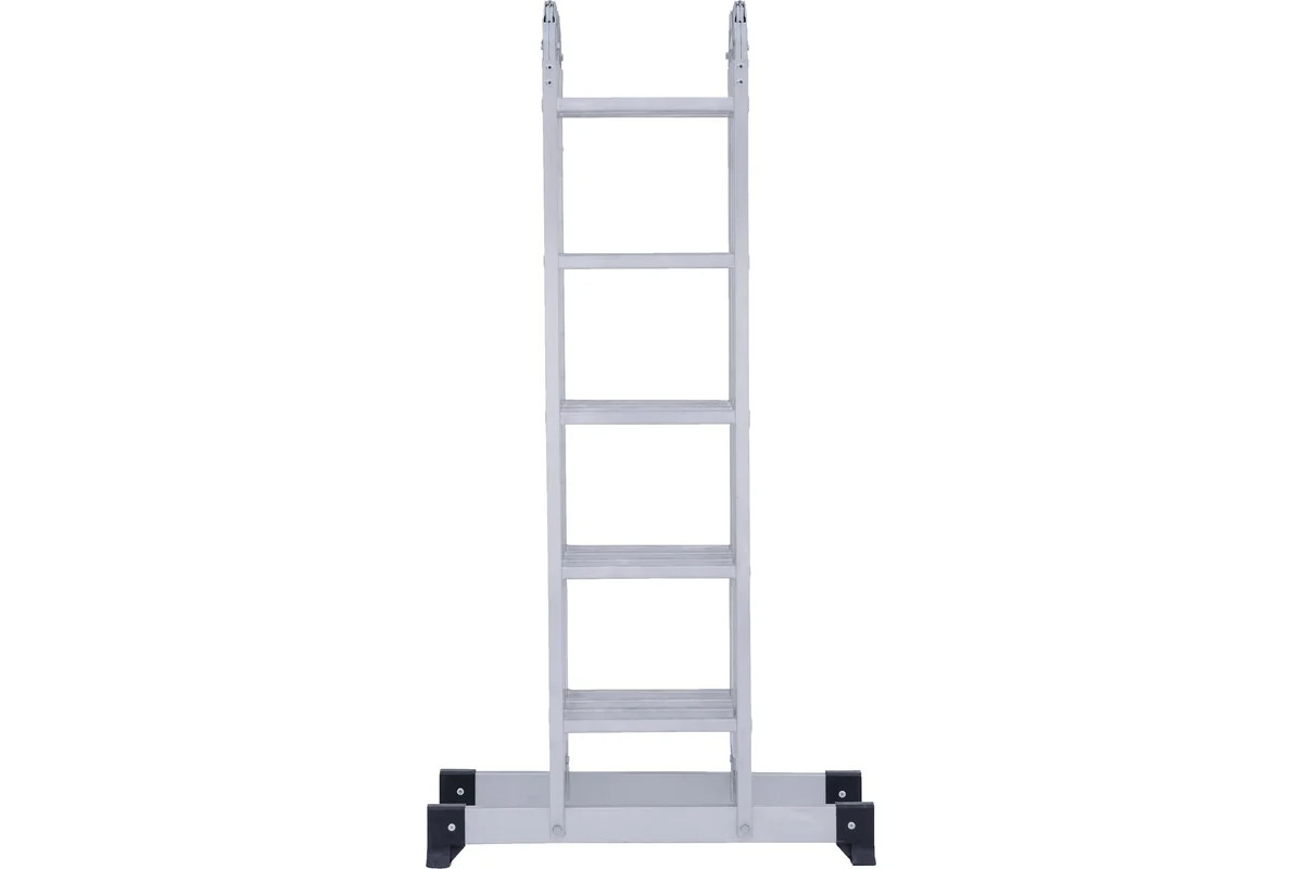 Четырехсекционная лестница-трансформер Новая Высота 4х5 1320405 предназначена для бытового использования. Легко трансформируется в помост, стремянку, приставную лестницу, лестницу с выносом. Оснащена стойками с дополнительным усилением в наиболее нагруженных местах для повышения жесткости. Шарнирные замки регулируются одной рукой. Благодаря многократной развальцовке в соединении ступеней со стойками изделие имеет долгий срок службы.