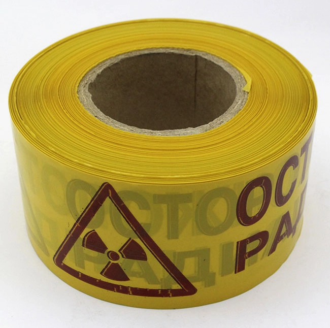Надпись красного цвета «ОСТОРОЖНО РАДИАЦИЯ» нанесена по всей длине ленты жёлтого цвета, делая её заметной с большого расстояния.