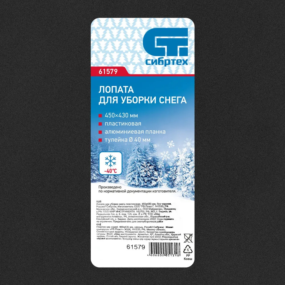Лопата для уборки снега пластиковая 450х430 мм без черенка СИБРТЕХ