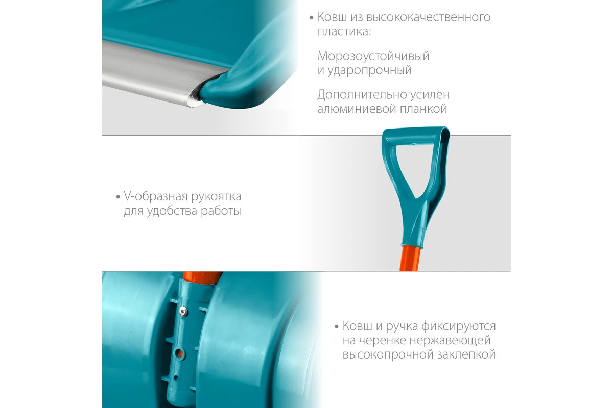 Пластиковая снеговая лопата Grinda PROLine Fiber-400 400 мм 39941 подходит для очистки территории от снега. Этот высококачественный инструмент создан специально для работы в холодное время года и сочетает в себе продуманную функциональность и продолжительный срок службы. Надежность. Рабочая часть лопаты изготовлена из морозоустойчивого ударопрочного пластика и имеет алюминиевую окантовку, защищающую кромку рабочей поверхности от повреждений. -Особо прочный и одновременно легкий фибергласовый черенок. -Позволяет комфортно работать на морозе без перчаток. -V-образная рукоятка для удобства работы. -Ковш из высококачественного пластика, морозоустойчивый и ударопрочный. -Ковш дополнительно усилен алюминиевой планкой.