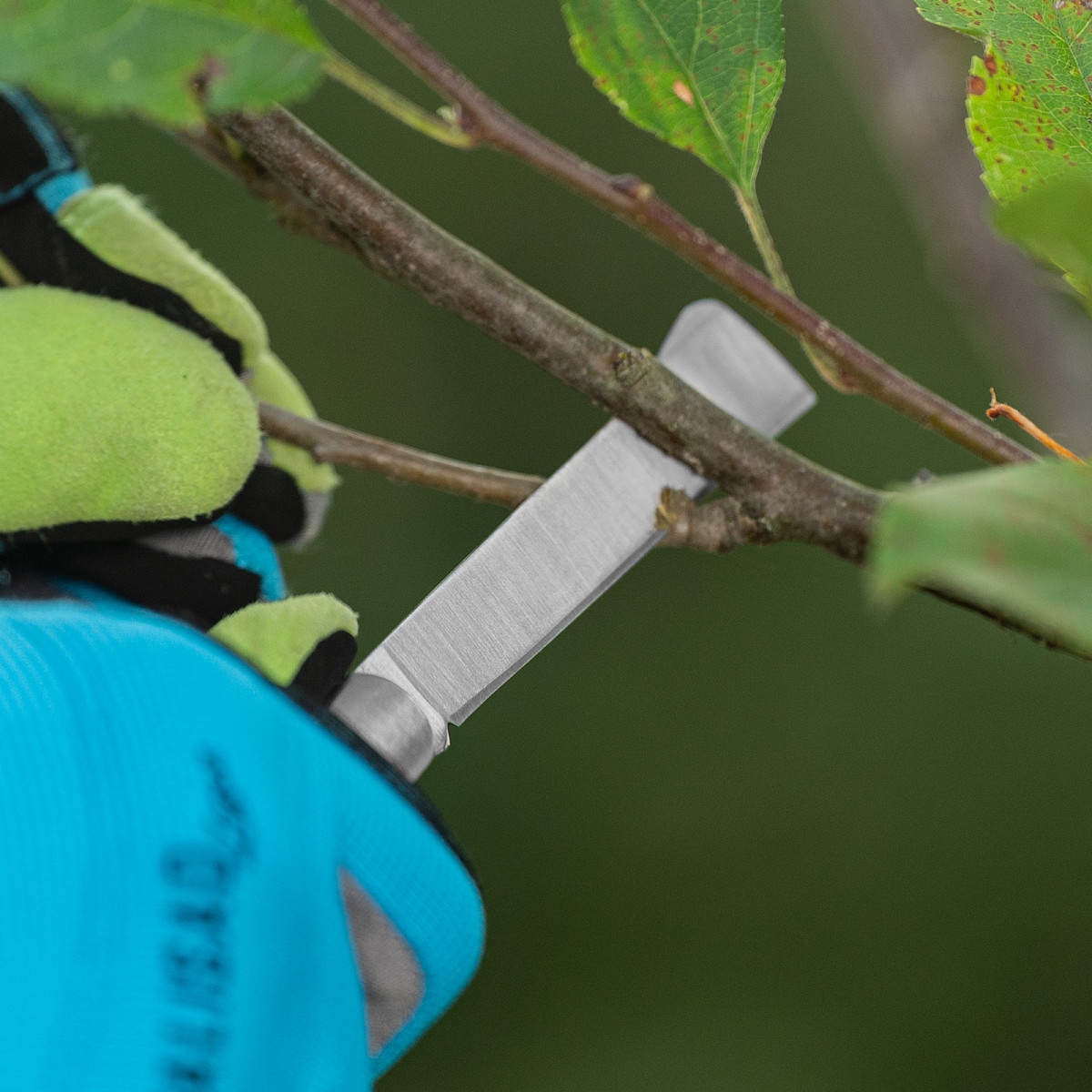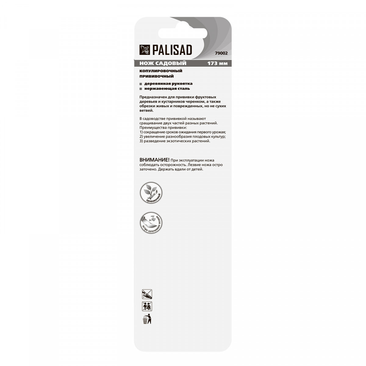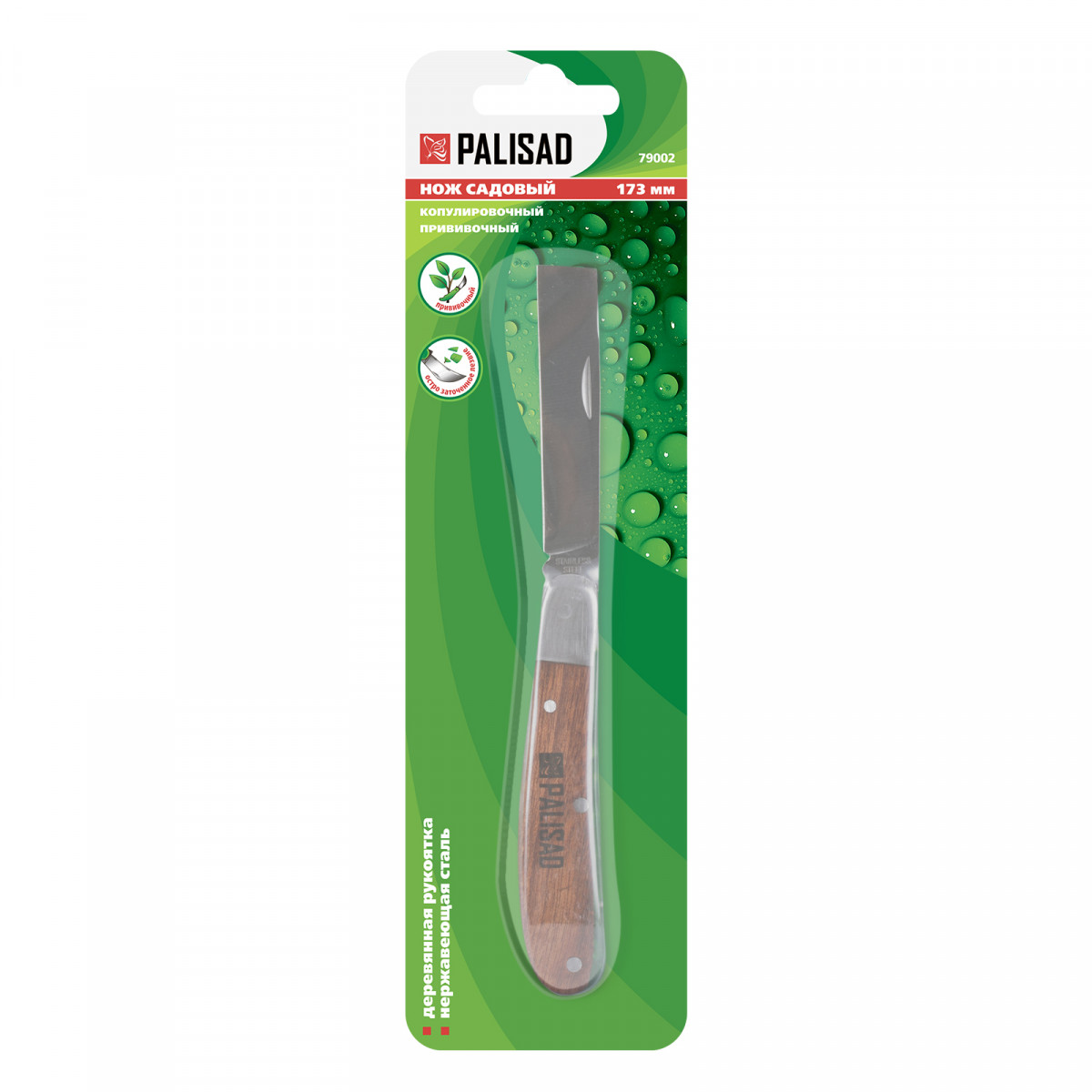 Садовый складной копулировочный нож Palisad 79002 длиной 173 мм, с деревянной рукояткой, используется для прививки черенком, отличающейся высокой скоростью срастания подвоя и привоя. Выступ на спинке лезвия позволяет легко отодвигать кору при прививке. Инструмент можно применять для обрезки веток или брать с собой в качестве туристического ножа. Для сохранения остроты лезвия после каждого применения следует протирать его салфеткой и смазывать маслом.
