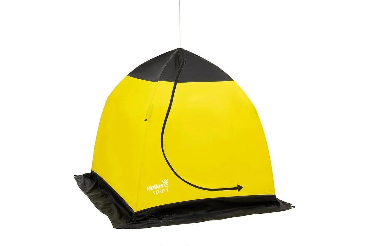 • Размеры в рабочем состоянии, м.: диаметр (по низу) 2,0 ; высота 1,5 • Размеры в транспортном положении, м.:1,1х0,25 • Вес, кг: 2,65 • Вместимость: 1 человек. • Материал: полиэстер Oxford 210D (PU 1000 мм) • Каркас: дюралюминий 8 мм • Цвет: желтый/черный Палатка зимняя NORD-1 Extreme от торговой марки Helios быстросборная с зонтичным каркасом из дюралюминия диаметром 8 мм устойчива к ветру. В верхней части зонта расположено вентиляционное окно, закрывающееся замком, снаружи защищенное от снега и ветра защитным клапаном. Широкая ветрозащитная юбка помогает удерживать тепло внутри и предохранит от воздействия внешних факторов. По углам юбки усиленной стропой сделаны люверсы большого диаметра. С помощью ввертышей NORD-1 легко зафиксировать на льду (ввертыши в комплект не входят)