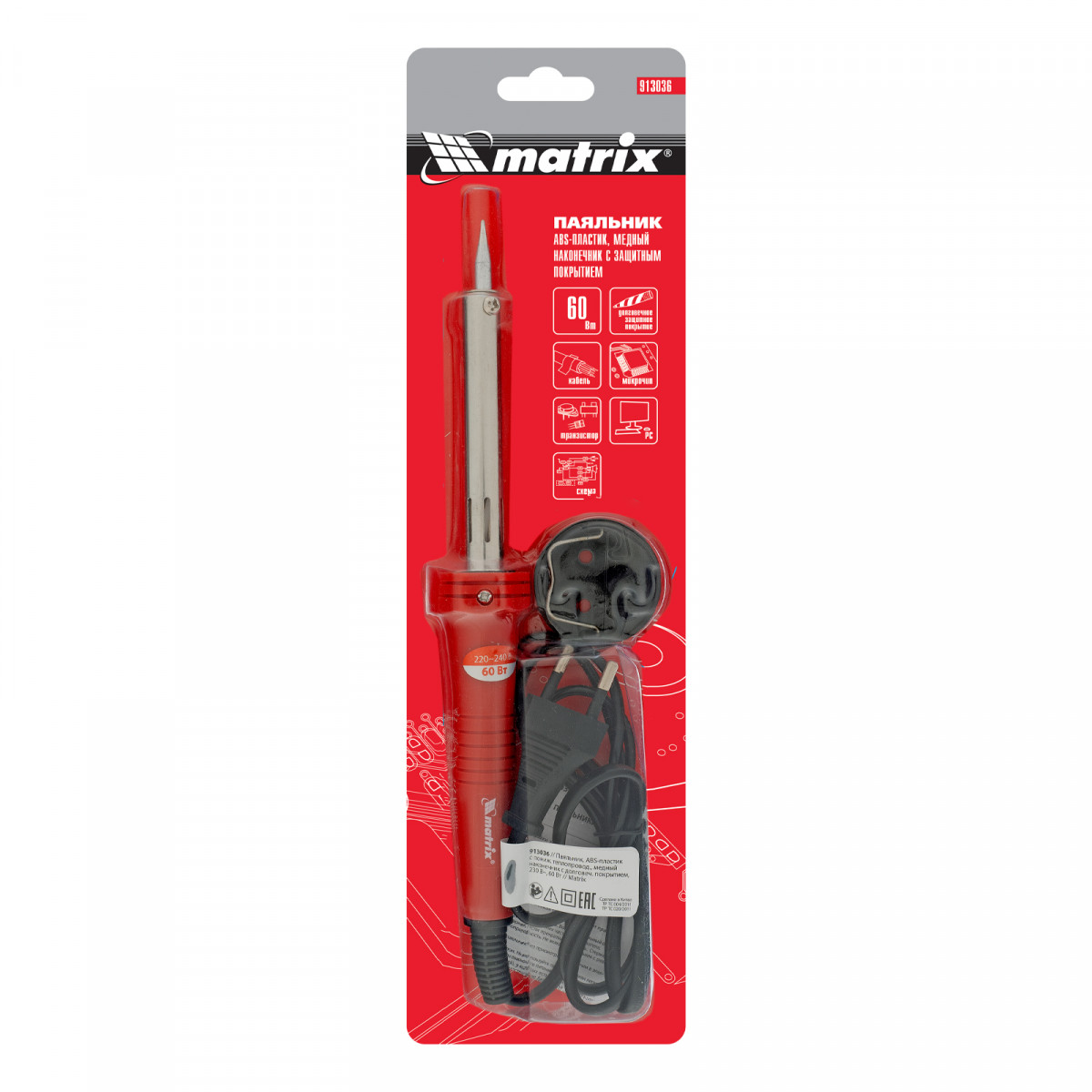 Паяльник, пластик ABS с пониженной теплопроводностью, медный наконечник с долговечным покрытием, 220 В, 60 W Matrix
