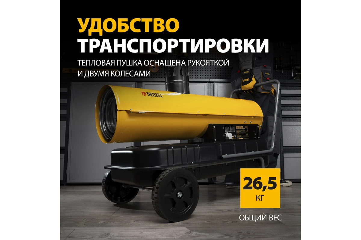 Дизельная тепловая пушка непрямого нагрева DENZEL NHG-30i 96492 с цифровым термостатом обладает тепловой мощностью 30 кВт и генерирует поток теплого воздуха 750 м3/ч.