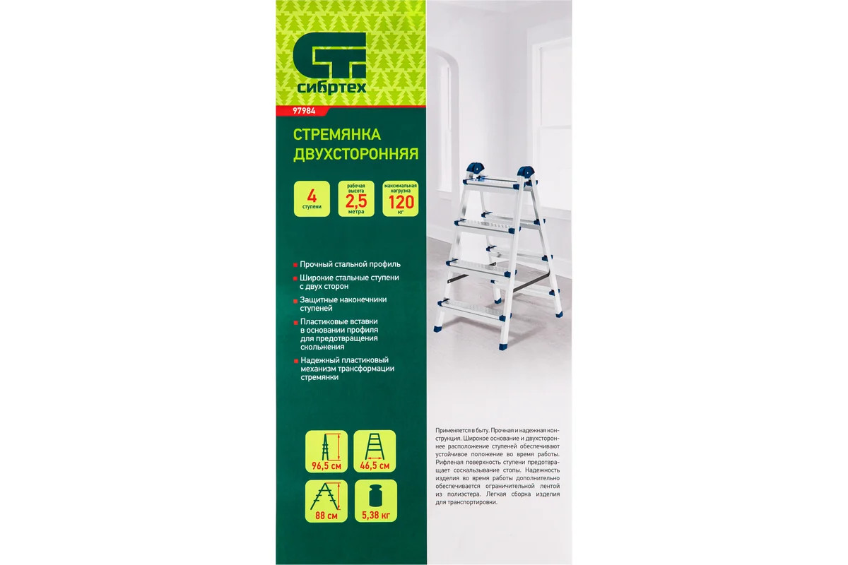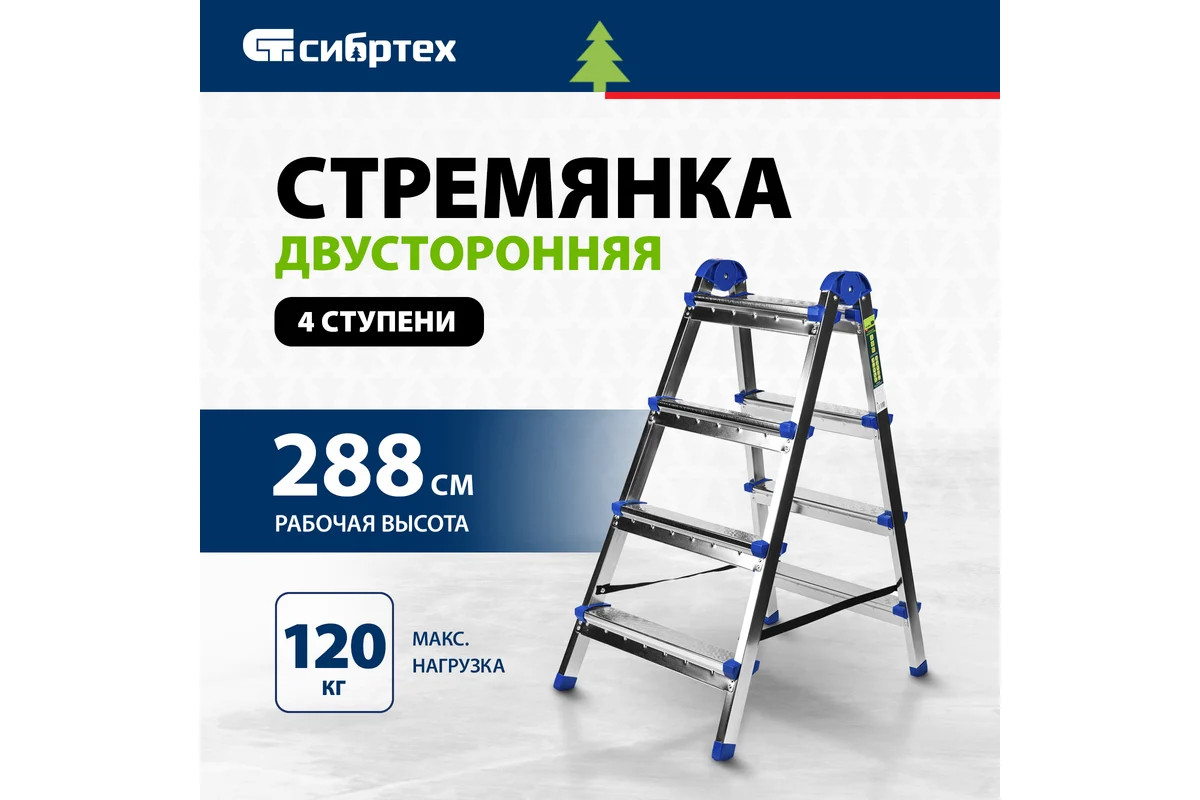 Стремянка двухсторонняя Сибртех 97984 со стальным профилем и 4 стальными ступенями помогает решать бытовые задачи на высоте, превышающей человеческий рост. Ее используют, чтобы доставать предметы с антресолей или шкафов, проводить уборку, менять лампочки, вешать полки или картины. Работать с электроинструментом на ней не рекомендуется. Стремянка с пластиковым складным механизмом повышенной стабильности и широким основанием очень устойчива на ровной поверхности. Площадка находится на высоте 88 см от опорной поверхности, рабочая высота стремянки составляет 288 см (при среднем росте пользователя 170 см).