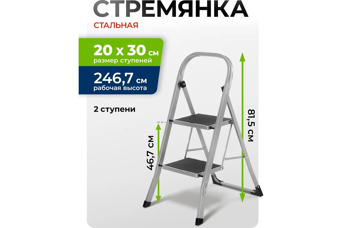 Стальная стремянка Сибртех 97726 с 2 широкими ступенями размером 20 x 30 см, с полимерным покрытием, позволяет выполнять различные работы на высоте, превышающей человеческий рост. С ее помощью можно достать нужный предмет с полки, покрасить стену, поменять лампочку, вытереть пыль на шкафу и т.д. Верхняя ступень находится на высоте 46,7 см от опорной поверхности, рабочая высота составляет 246,7 см (при среднем росте пользователя 170 см). Дуга безопасности и широкие ступени с нескользящим покрытием обеспечивают устойчивое положение пользователя. Стремянку следует размещать на ровной поверхности и использовать для работы только с ручным инструментом.