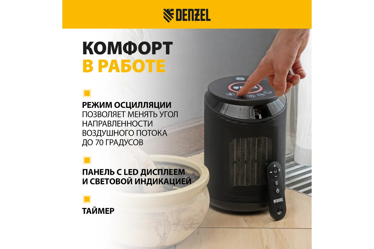 Электрический тепловентилятор Denzel DTFC-2000, керамический, пульт, 3 режима, вентилятор, нагрев 1000/2000 Вт 96419 с керамическим нагревательным элементом предназначен для обогрева и вентилирования бытовых помещений площадью до 20 м.кв.