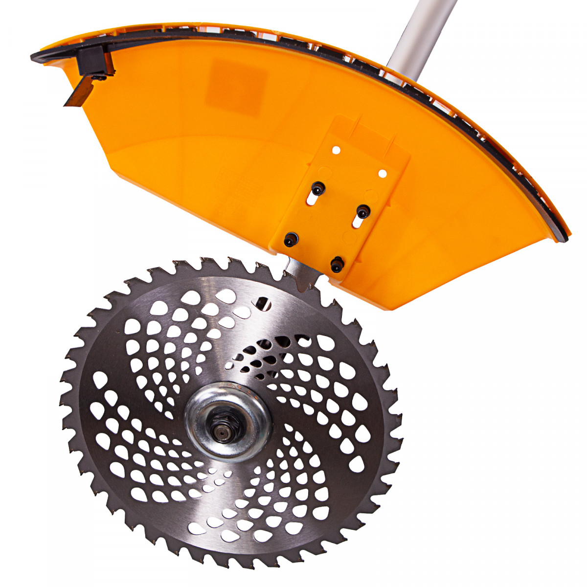 - Дополнительные возможности — можно приобрести и установить на триммер диск Denzel 96323 для быстрого удаления растительности с жесткими стеблями, 96328 для скашивания молодых побегов кустарника диаметром до 3 мм.